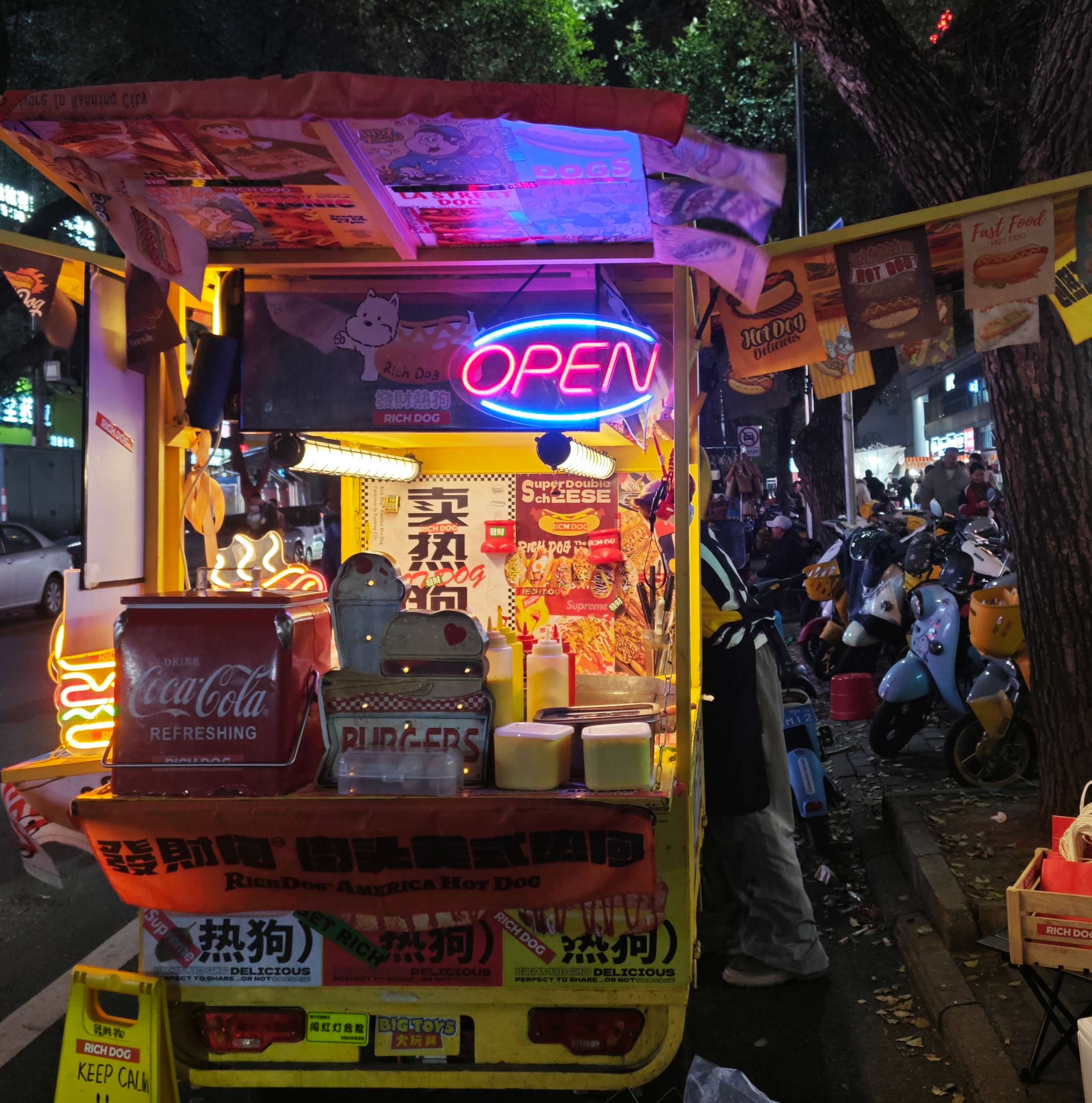 The glowing "Open" attracts customers to Lee's street-side burger shop.