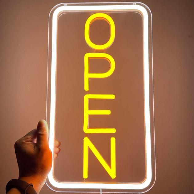 Vertical Neon Open Sign: Space-saving designs with maximum visibility.